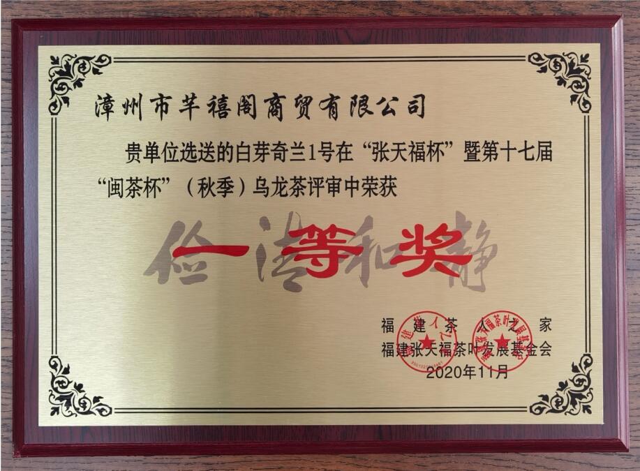 2020年“张天福杯”暨第17届“闽茶杯”乌龙茶白芽奇兰荣获【双一等奖】
